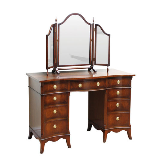 This Mahogany Serpentine fronted Dressing Table has twin pedestals standing on a shaped apron with splay feet. It is fitted with a secret jewellery drawer and has an optional freestanding mirror.rnTo compliment this or any of our Dressing Tables this triple Dressing Mirror has a beautiful swept shape and fine detailing.