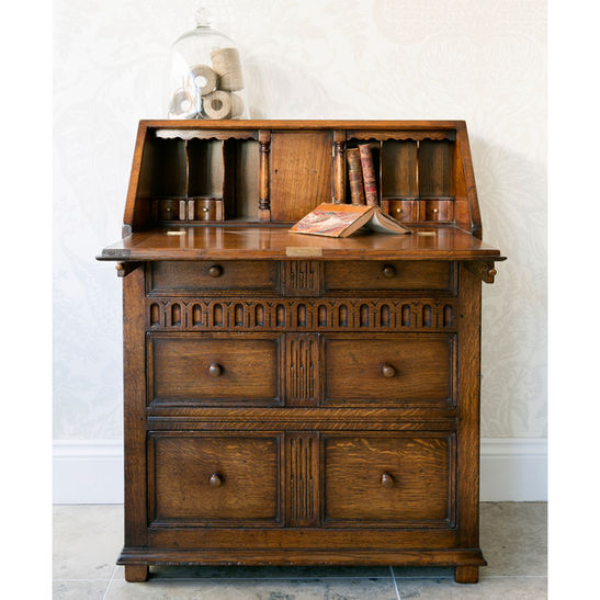 An Oak bureau with carved, fluted decoration to the centre rail. The interior is fitted with a myriad of small pin drawers aside the central pilastered door. The fall is laid with a tooled hide top and secured by a brass 4-lever lock stamped with the Titchmarsh & Goodwin insignia. The drawers are mounted with turned Oak knobs.