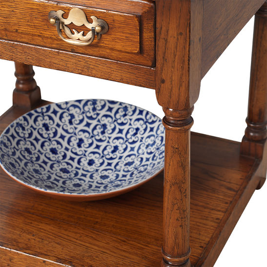 An Oak end table with thumb-moulded top. This has a practical drawer with fielded panelled front, raised upon simple barrel-turned legs and a useful pot shelf.