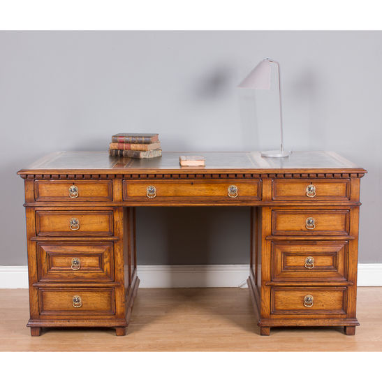 An imposing Oak kneehole desk with geometric mouldings from the Stuart period. The top featuring three tooled hide panels and a dentilled under-mould. This piece is panelled and polished on both sides.