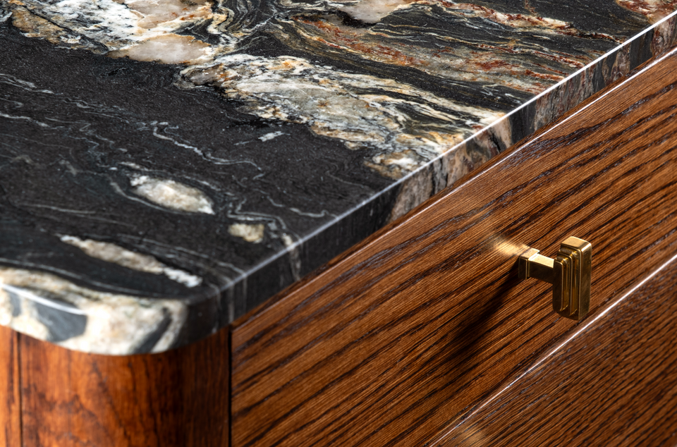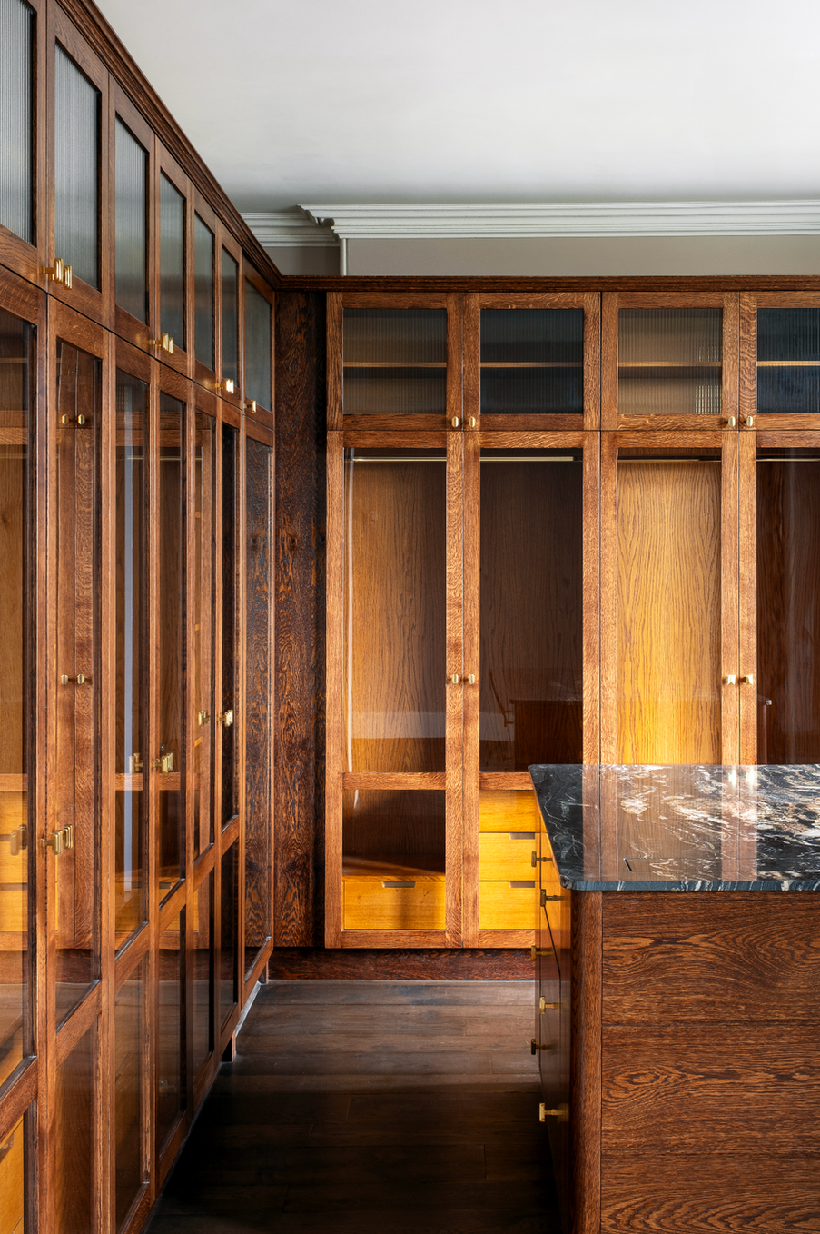Soft internal cabinet lighting ensures effortless visibility, illuminating each section to highlight the natural beauty of the handcrafted oak cabinetry. The combination of rich, dark wood and lighter finishes creates a striking contrast, adding warmth and character to the room while complementing a variety of interior styles.